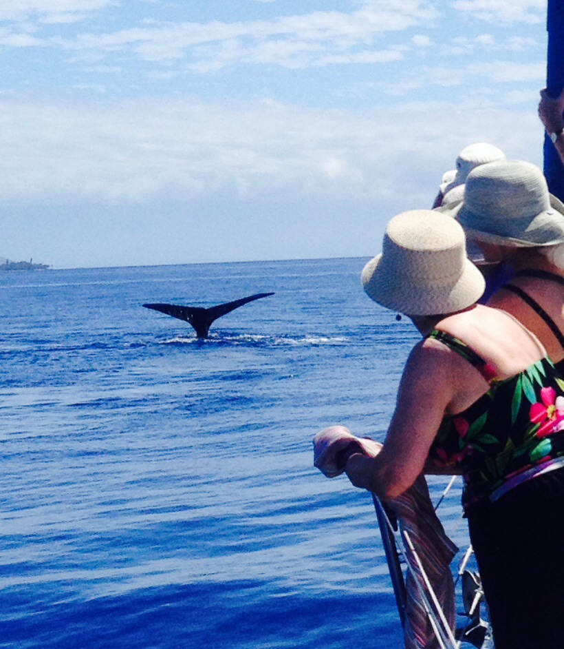 We had all swung right when two very large whales broke the water surface and did a perfectly synchronized double-breach, mid – air. Like 4th of July, the crowd oohed and ahhed. It was as if we were at Sea World watching a dolphin show, but with huge whales, in the wild, with no trainer. Mike said he had seen a double- breach maybe 30 times in his entire life in Hawaii. I had never seen it. What a special moment. No photo of course – – and if I’d had my head glued to a camera I wouldn’t have truly experienced it.