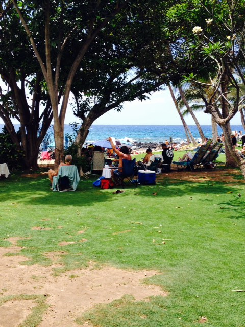 The beach is adjacent to the Mana Kai hotel. There is Zack’s Deli, a good place to grab a wrap for lunch. And if you’re willing to part with some cash, there is the Five Palms Restaurant, with covered outdoor seating, a spiffy bar, and a really lovely dining room. (It used to be our go-to for special occasions, but then the prices got to be more than as locals we were willing to spend.) I still miss the days of $8.95 crab cakes there for brunch!